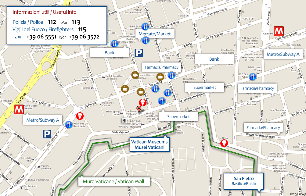 Casa ANNA si trova in Via Sebastiano Veniero 72, a pochi passi dall'entrata principale dei Musei Vaticani, in una zona centrale accogliente e tranquilla. Molti negozi, supermercati, pub e ristoranti e il mercato trionfale sono nelle immediate vicinanze. E' molto ben servita dai mezzi pubblici, molto vicine ci sono le stazioni della metropolitana linea A di Cipro-Musei Vaticani e Ottaviano e il capolinea degli autobus di Piazza Risorgimento. Video: Dall'entrata dei Musei Vaticani a casa... |